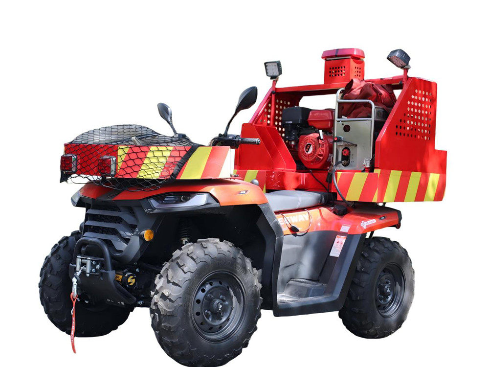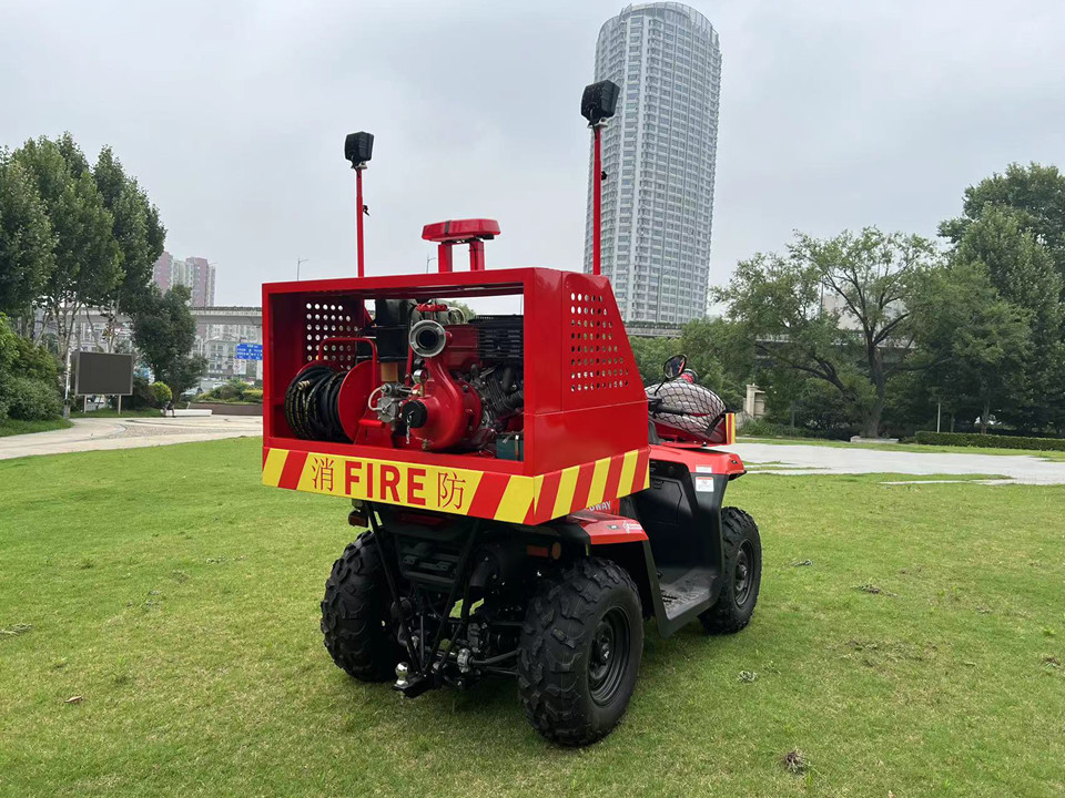 ATV全地形消防摩托车, 依据定制开发的专用车型底盘,加装自主研发细水雾灭火系统和手抬泵,适用于空间狭窄、大型车辆无法进入的火灾现场展开灭火救援和现场清理等工作。 细水雾灭火系统和手抬泵为集成产品,可自由拆卸、独立使用。